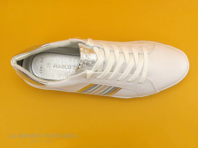 Elles se démarquent avec leur semelle pailletée argent et leur pointe légèrement effilée, les sneakers blanches Marco Tozzi 2-23714-32 !