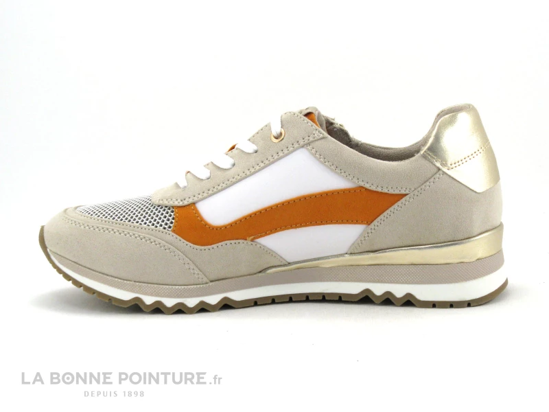 Voici de sĂ©duisantes baskets compensĂ©es beiges Marco Tozzi 2-23730-28, avec des petites touches de blanc, d’orange et de dorĂ©.