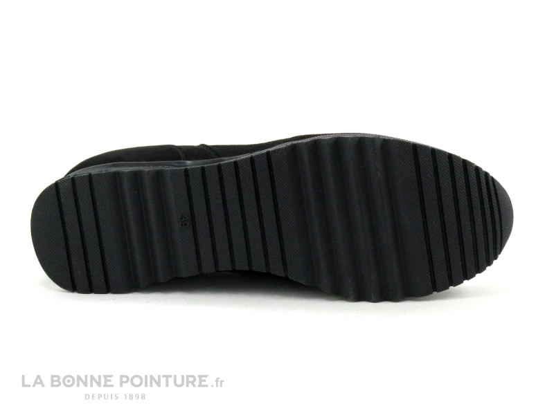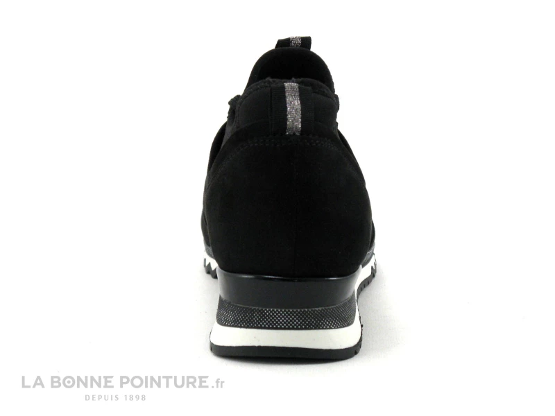 Cette chaussure Femme Marco Tozzi est en textile velouté noir, avec une petite languette au liseré argenté dessus.