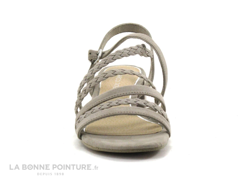 Ce nu-pieds Femme Marco Tozzi 28203 est en textile velouté beige taupe, avec plusieurs lanières tressées qui caractérisent la chaussure.
