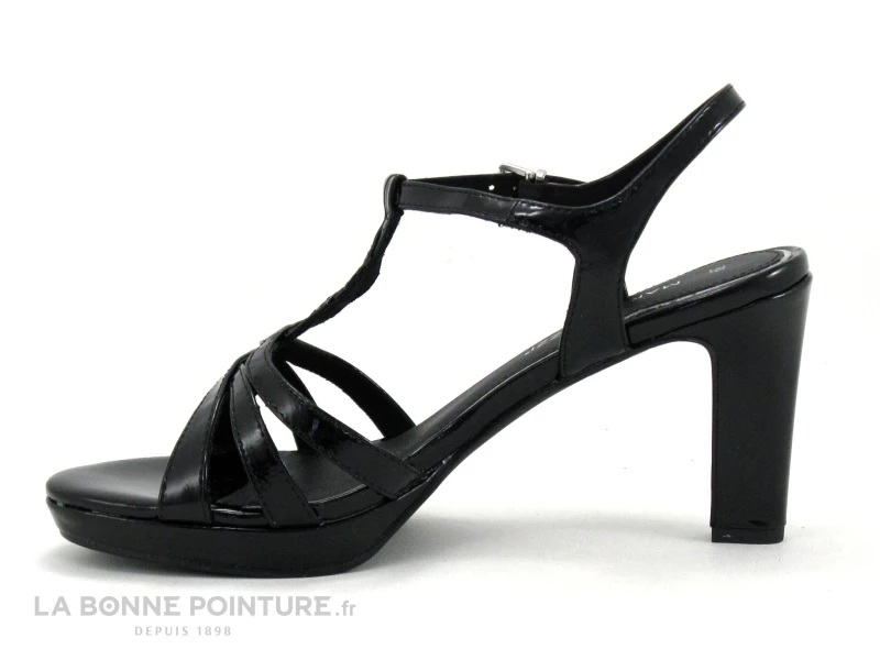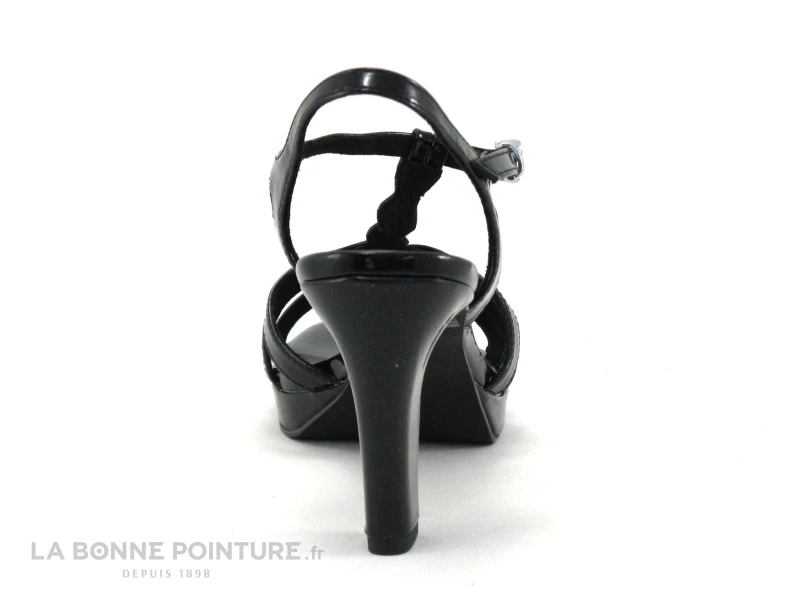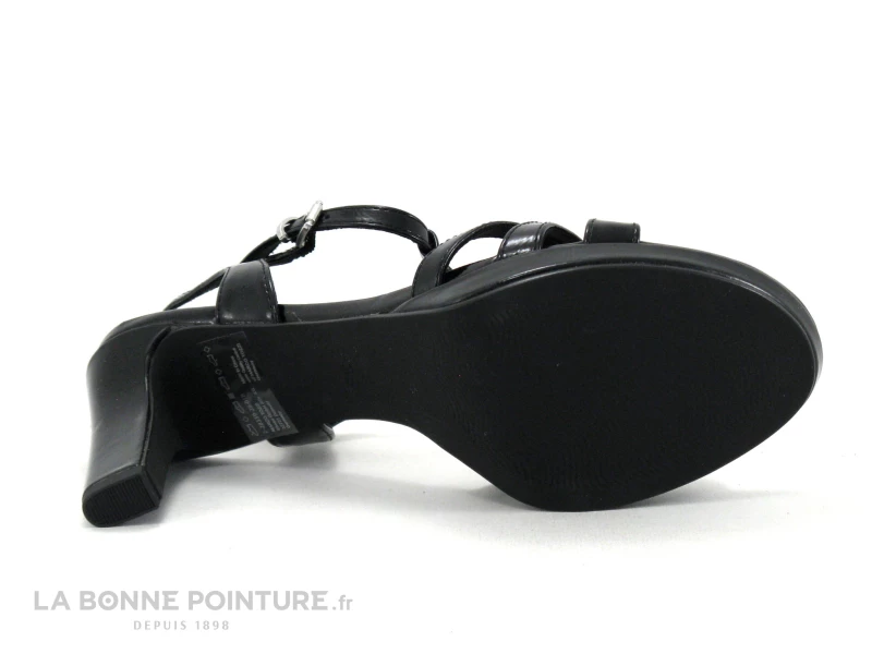Cette sandale noir verni à talon haut Marco Tozzi 2-28339-28 possède une bride salomé torsadée, qui habille joliment le dessus du pied.
