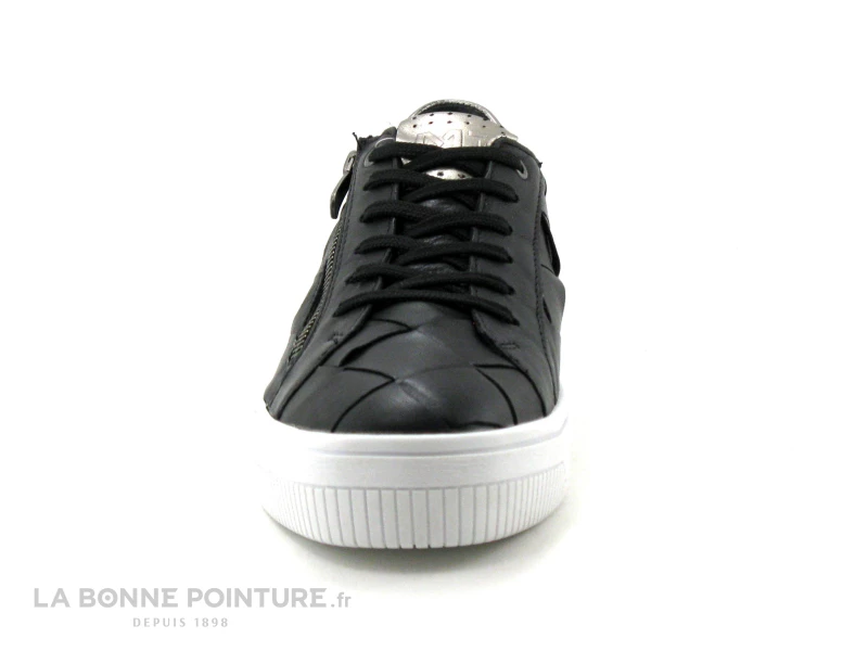 Cette basket Femme avec zip Marco Tozzi est en cuir lisse noir, avec des parties tissées qui caractérisent la chaussure.