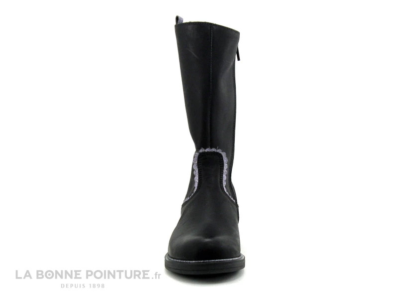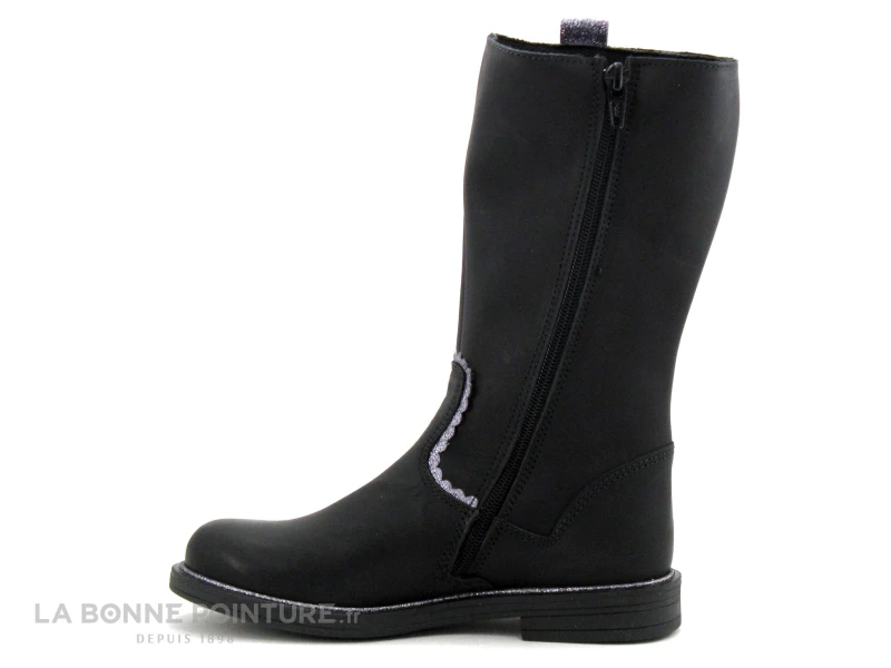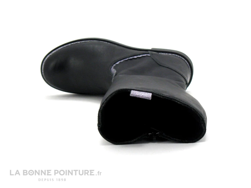 Cette botte enfant est en cuir noir mat, avec un liseré dentelé argenté sur l’avant, et une petite languette pailletée en haut de la chaussure.