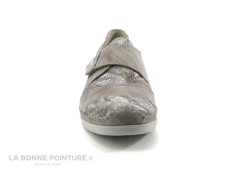 Cette chaussure Femme à semelle compensée est en cuir beige nuancé, avec des parties fantaisie aux tons de blanc, d’or et de gris argent.
