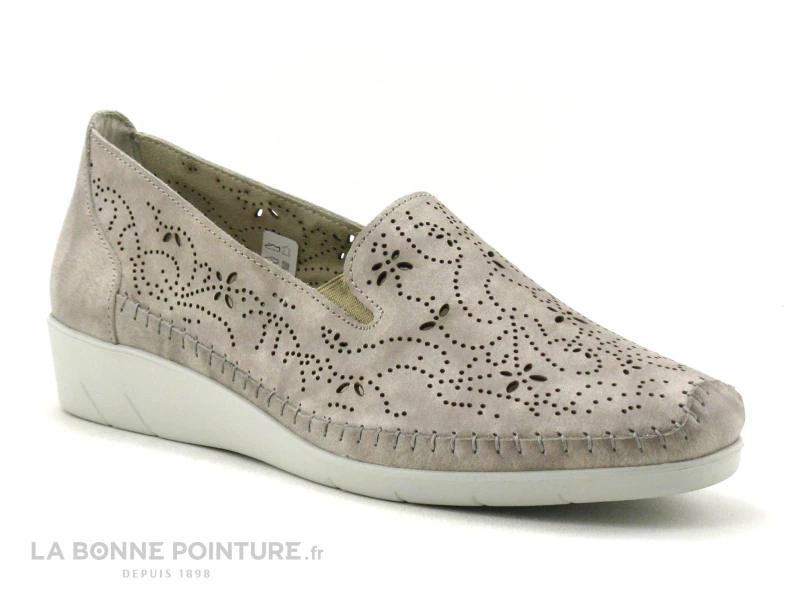 Cette chaussure aérée Femme est en cuir beige nuancé, avec la tige délicatement perforée.