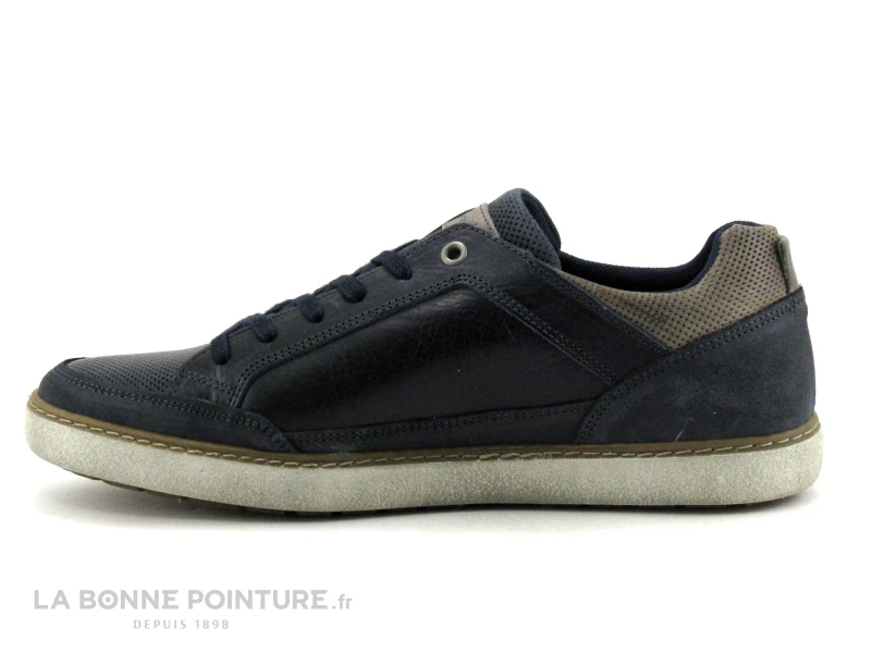 Cette basket de ville Homme Morans Sapro combine cuir lisse et cuir velours bleu marine, avec une petite partie beige à l’arrière de la chaussure.