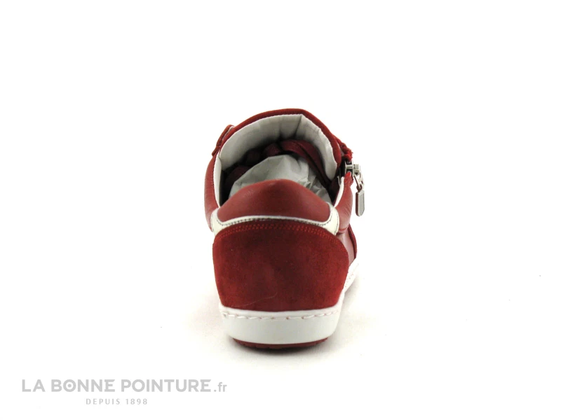 Cette basket basse Femme combine cuir lisse et cuir velours rouge foncé, avec une petite partie argentée à l’arrière.