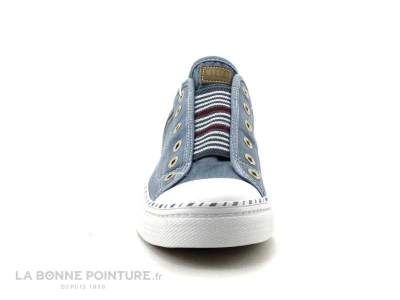 La languette de la tennis en toile Femme Mustang est traversée par un élastique invisible, qui permet d’enfiler rapidement la basket. Les oeillets argentés sont juste décoratifs.