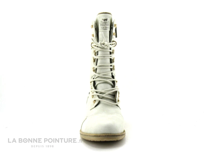 Cette chaussure montante Mustang est en simili cuir blanc cassé, avec des oeillets fantaisie et crochets dorés traversés par un lacet beige.
