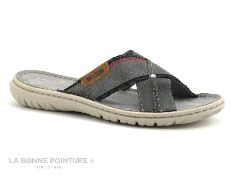 Cette mule homme est en simili cuir gris aspect grainé, avec une partie en denim noir et une couture rouge.