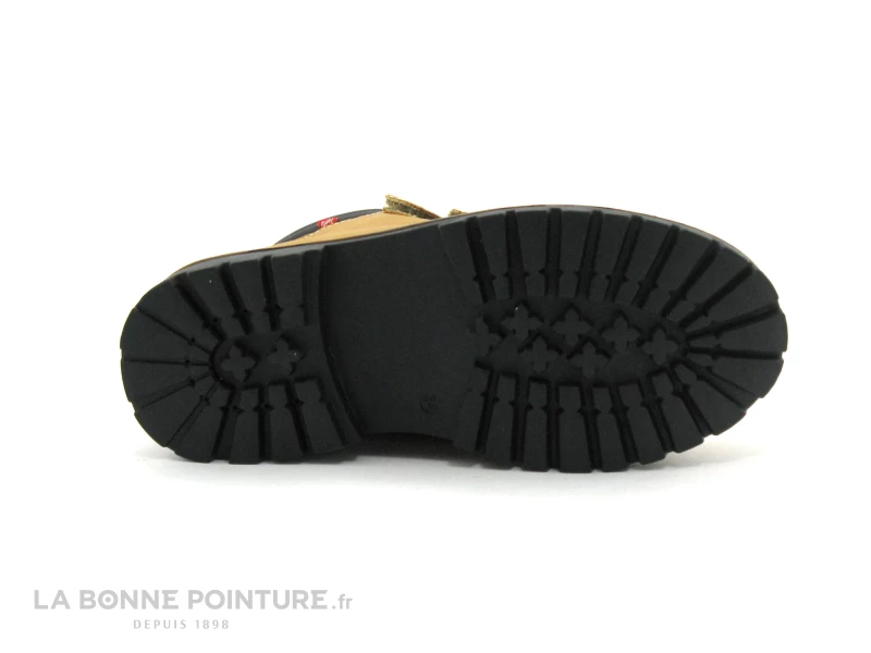 Cette chaussure montante enfant est en simili cuir camel / jaune gold, avec l’encolure noire et matelassĂ©e.
