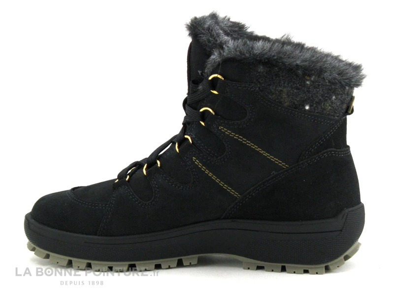 Le lacet noir traverse 5 oeillets dorés afin de fermer efficacement ces belles boots en daim noir Olang Venus Tex.