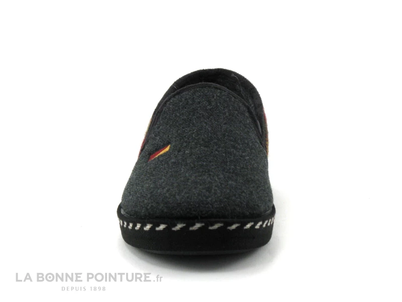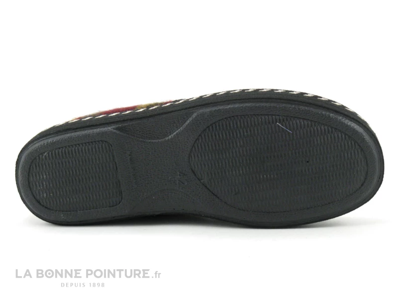 Cette charentaise pas chère Messieurs est en textile molletonné, avec une partie unie grise sur le devant et l’arrière écossais bordeaux et jaune.
