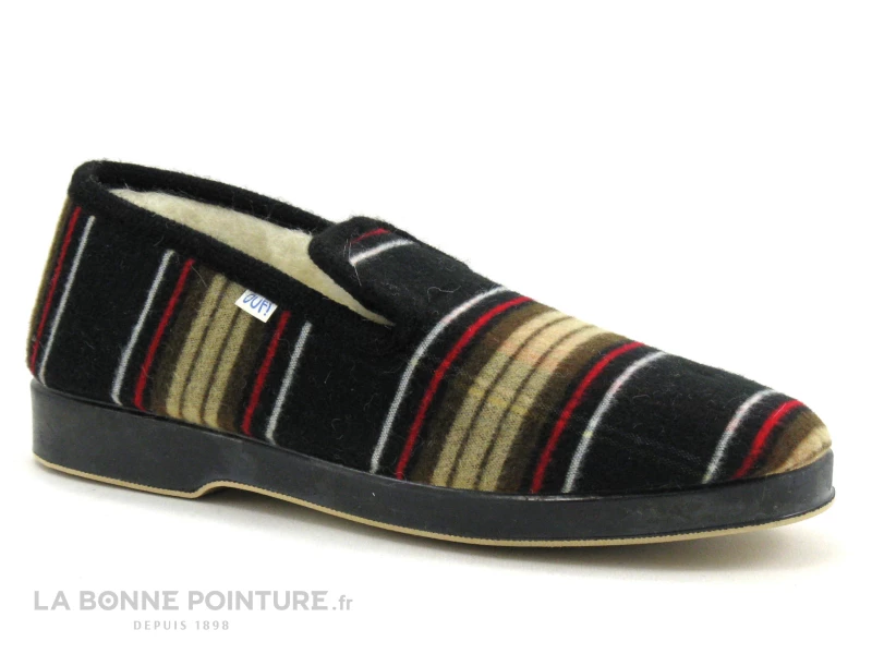 Cette pantoufle chaude Homme Ouf Cideo est en textile molletoné à rayures, aux tons de noir, de beige, de marron et de rouge.