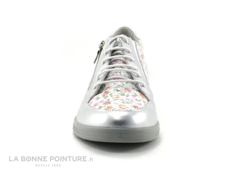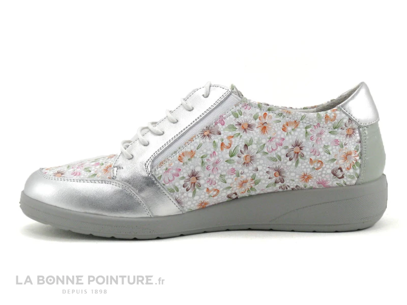 Cette basket basse Femme est tout en cuir, avec des parties argent et imprimé floral aux tons de vert, de rose, d’orange et de blanc sur fond gris.