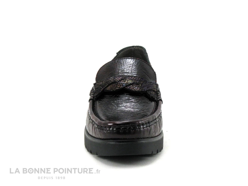 Ce mocassin confort Femme est fabriqué avec un beau cuir verni bordeaux nuancé, à l’aspect légèrement froissé.