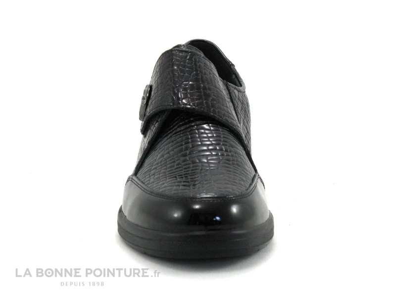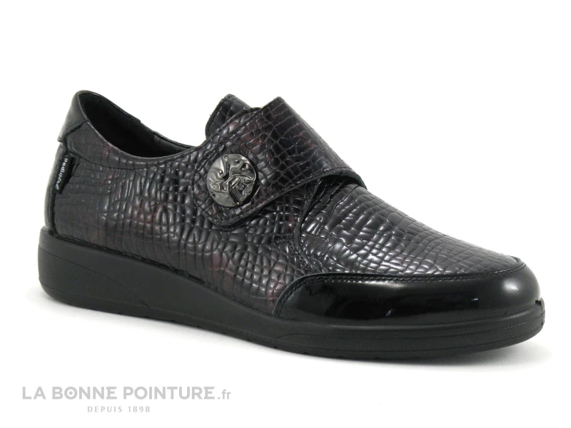 Cette chaussure basse Femme Pedi Girl est en cuir verni aspect croco bordeaux, avec des parties noires aux extrémités.