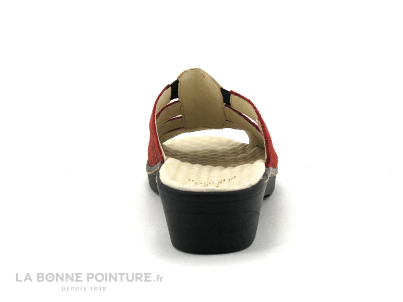 Cette mule confort Femme Pedi Girl mélange un cuir velouté rouge avec reflets métallisés et un cuir doré.