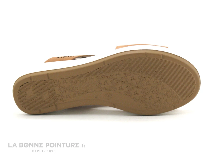 Cette nu-pieds compensĂ© est en cuir marron clair (apricot), composĂ© de 2 larges brides, l’une en cuir joliment perforĂ© et l’autre en cuir lisse.