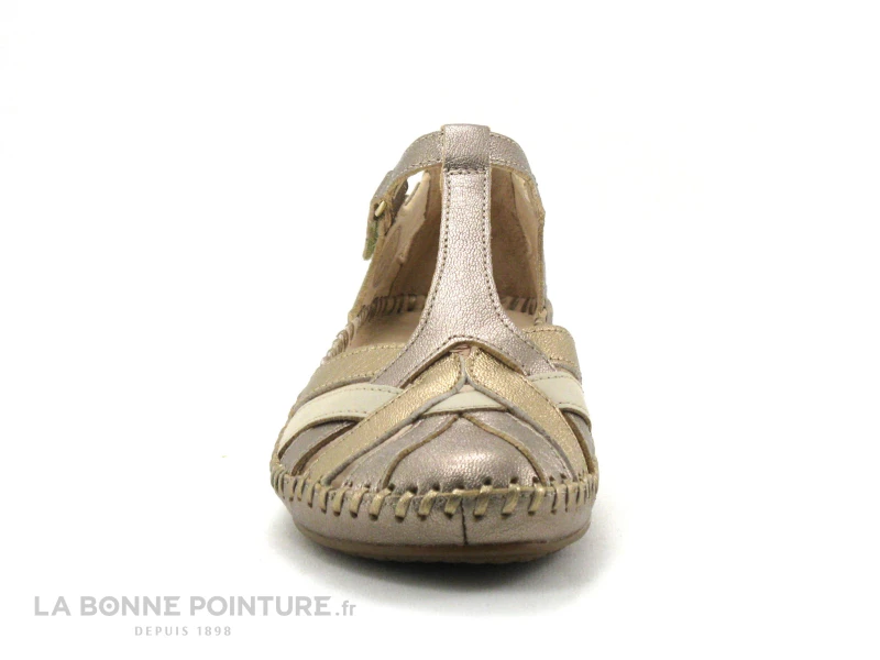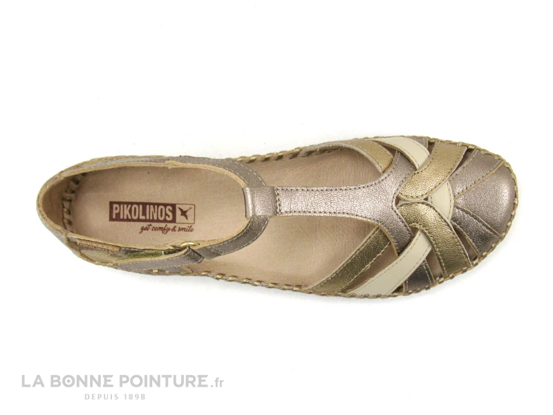 Ces sandales Pikolinos Femme sont fabriquées artisanalement avec un beau cuir souple Or métallisé, avec un peu de beige.