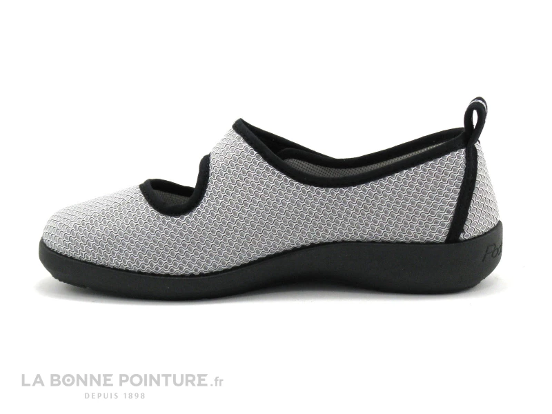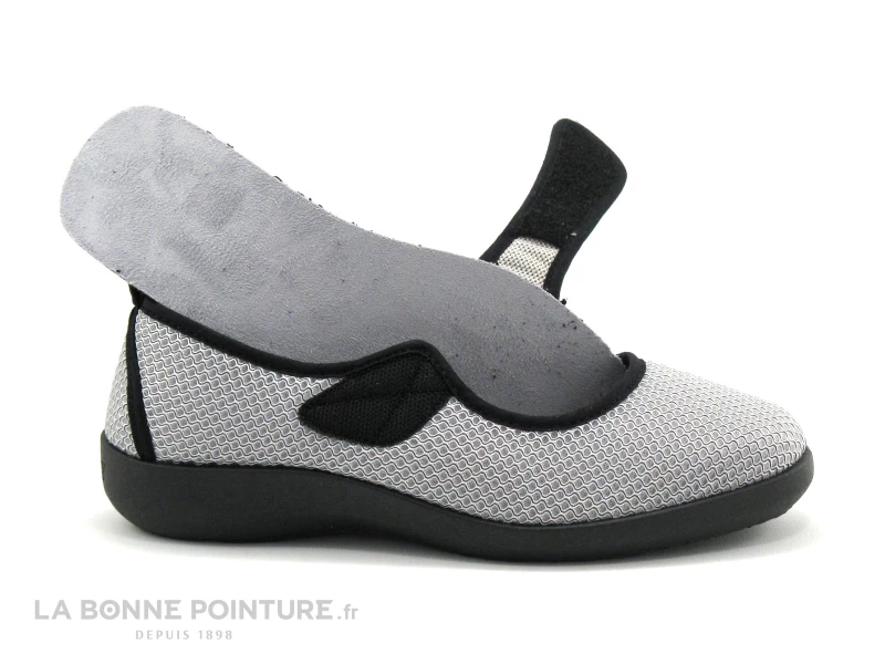Ce chausson femme en textile gris perle offre une large ouverture pour insérer facilement les pieds sensibles dans la chaussure Fargeot.