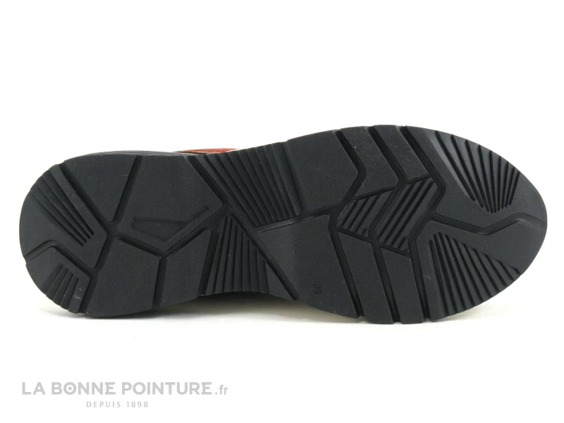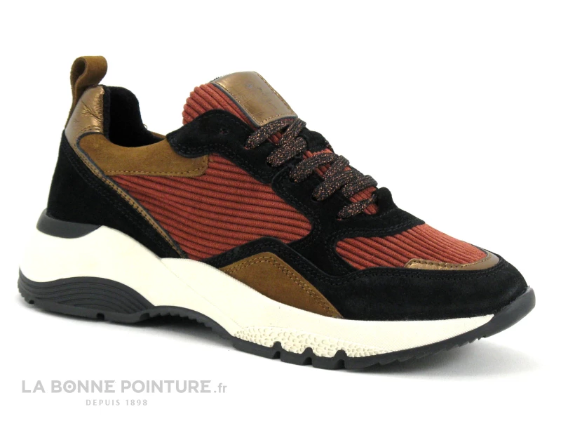 Cette basket de ville Femme Pretty Love mélange cuir velours noir et camel avec un textile côtelé brique, qui caractérise à ravir la chaussure.