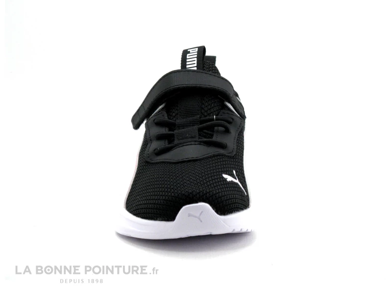 Cette chaussure de sport fille Puma est en textile aéré noir, avec du rose et du blanc sur les côtés.