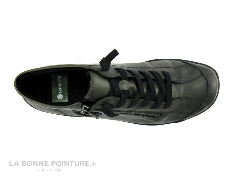 La fermeture éclair placée en biais côté externe facilite la fermeture et l’insertion du pied dans la chaussure Remonte kaki.