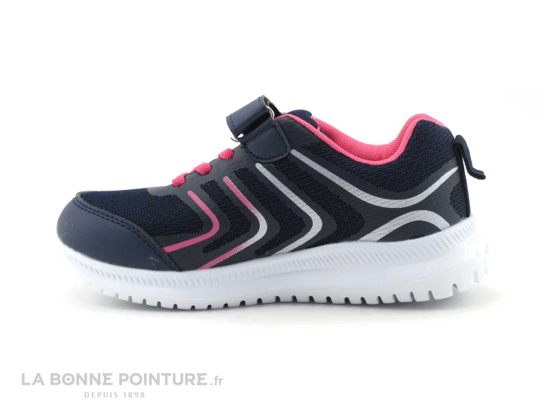 Cette chaussure de sport fille pas chère est bleu marine, avec une touche de rose et d’argenté.