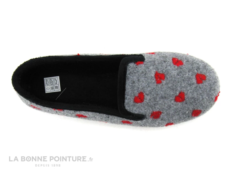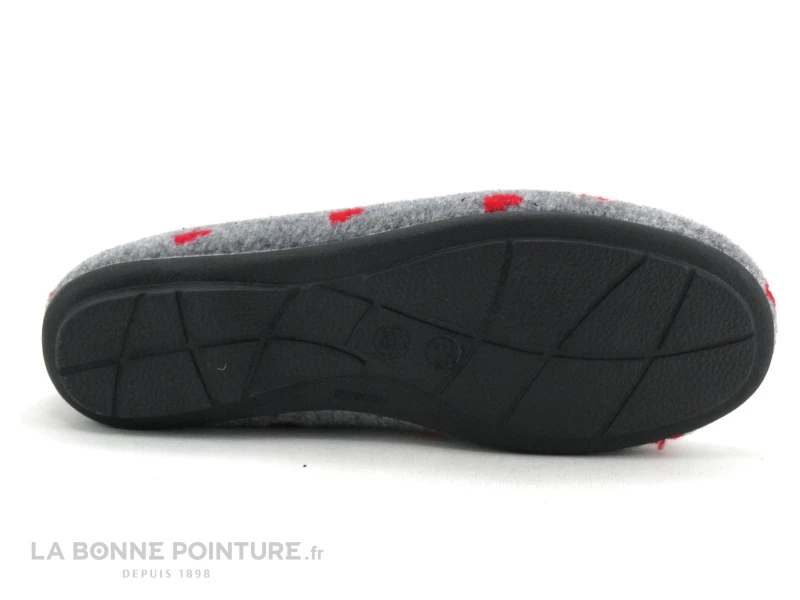Ce chausson Femme est en textile molletonné gris clair, parsemé de petits coeurs rouges.