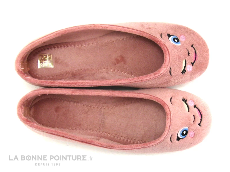 Cette pantoufle ballerine au chaussant large est en velours rose, avec un intérieur aussi en velours, doux et agréable.