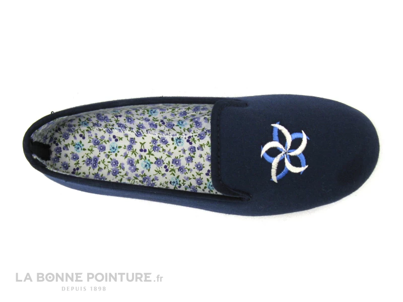 Ce chausson Femme est en tissu bleu marine, avec une fleur bleu ciel et beige brodée sur le dessus.