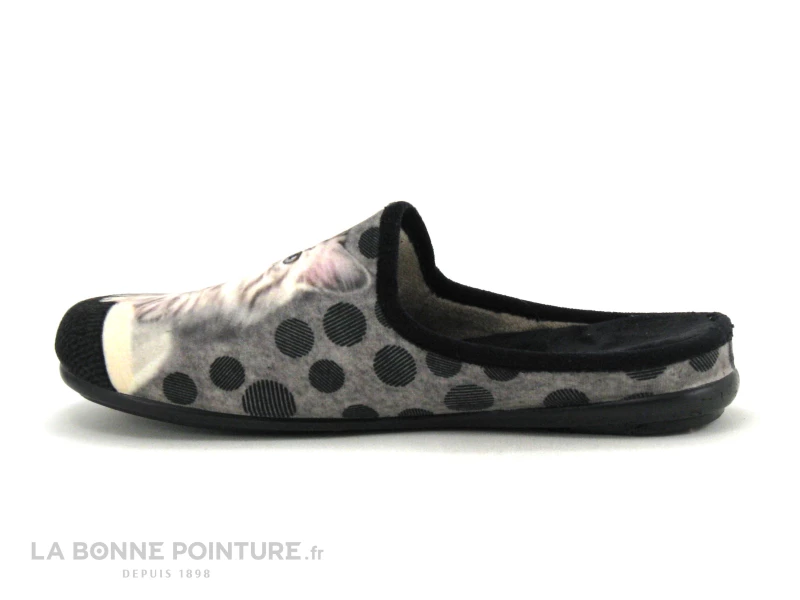 Cette pantoufle mule Femme petit prix est en velours, aux tons de gris, de noir et de beige avec un adorable chaton sur le dessus du chausson !