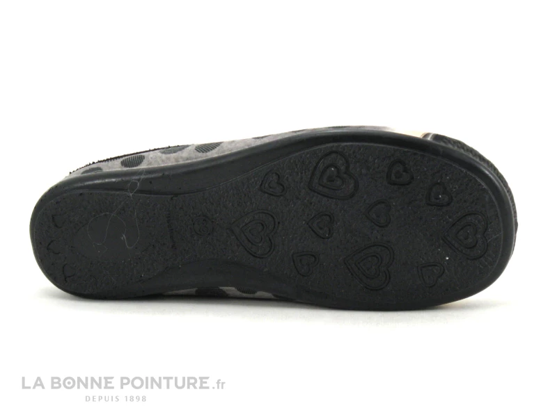 La semelle de marche des pantoufles fantaisie Femme petit prix Selkis 22357 est flexible et légère, noire avec des coeurs en-dessous. Le talon mesure environ 3.5 cm.