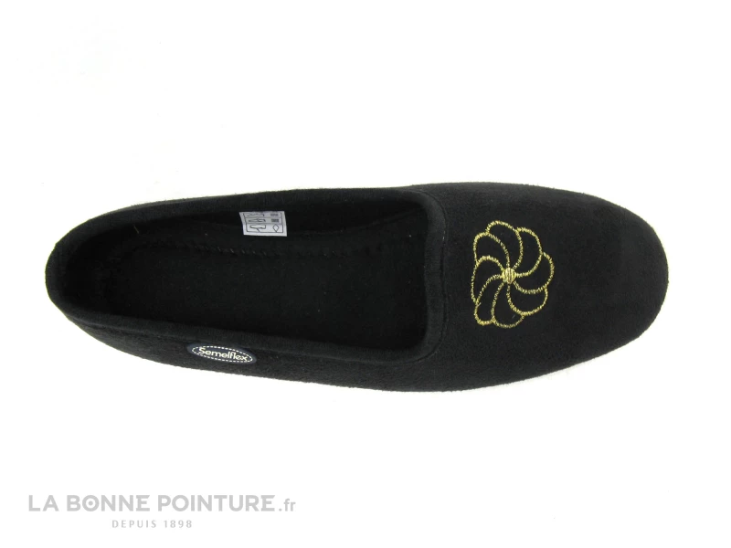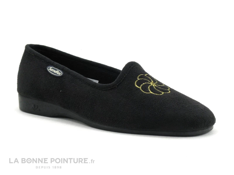 Ces chaussons femme sont en velours noir, avec une jolie fleur dorée brodée sur le dessus.