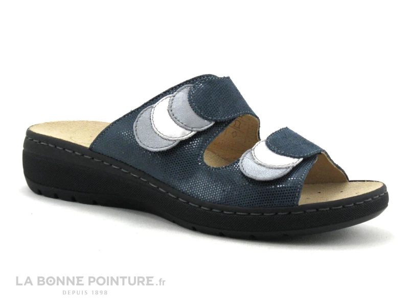Cette mule confort Femme Semelflex est en cuir velouté bleu foncé, à petits pois brillants.
