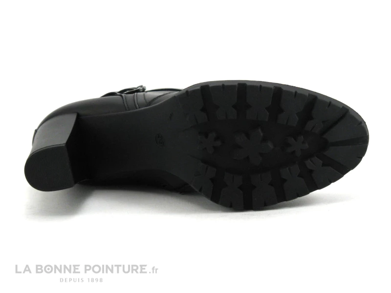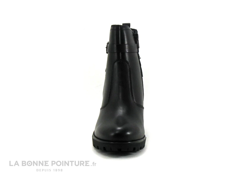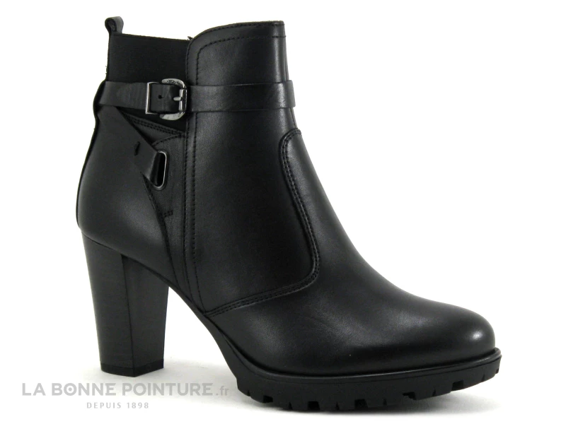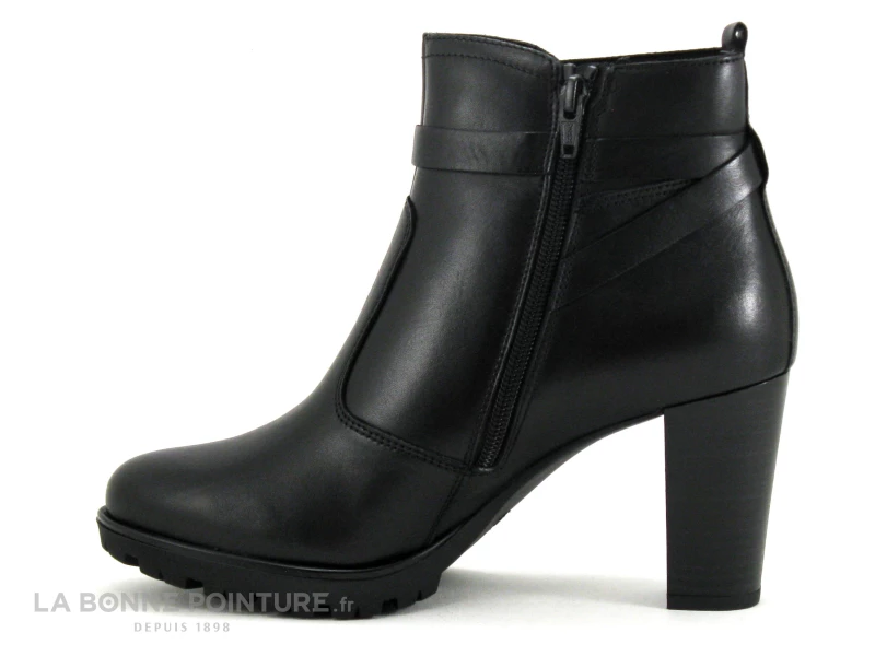Ces boots Femme sont en cuir lisse noir, avec un élastique sur le côté externe et une bride à boucle autour de la cheville.