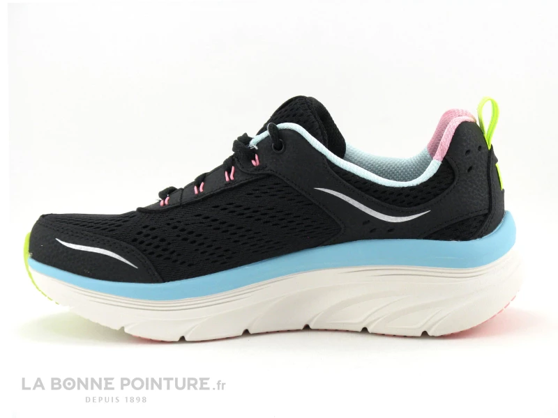 Cette chaussure sport Femme Skechers DLUX Walker Infinite Motion est en cuir et textile maille noir, avec des petites touches de bleu turquoise, de rose.