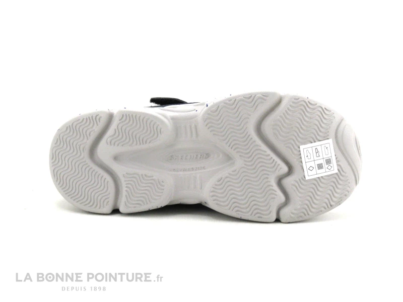 Le lacet élastique bicolore permet d’enfiler et de retirer rapidement la sneaker enfant Skechers Ravlor, qui se ferme avec la bride à scratch.