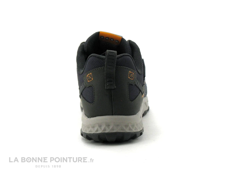 Cette chaussure de sport Homme combine cuir enduit, matières synthĂ©tiques et textile rĂ©sistants, aux tons de bleu et de gris foncĂ©, avec un peu d’orange.