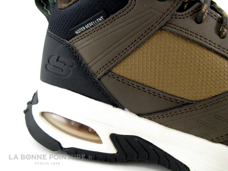 Cette chaussure montante Homme Skechers Outdoor est en cuir, textile et matières synthétiques résistantes, aux tons de noir et de marron.