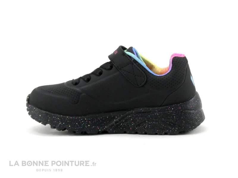 Cette jolie basket fille compensée Skechers Uno Lite est noir mat, avec la doublure multicolore que l’on aperçoit autour de la cheville.