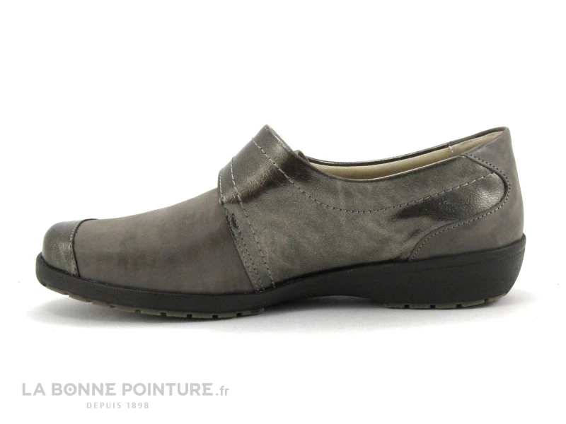 Cette chaussure classique Femme mélange mélange un cuir velours gris et un cuir argent métal aspect verni.