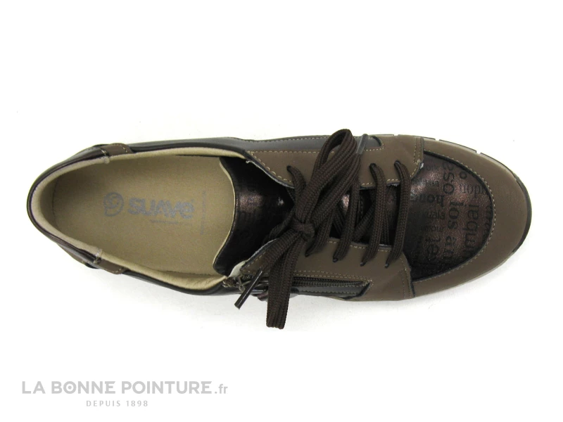 Cette chaussure basse Femme Suave Nancy mélange du marron clair et du marron foncé, avec des parties bronze et imprimées.