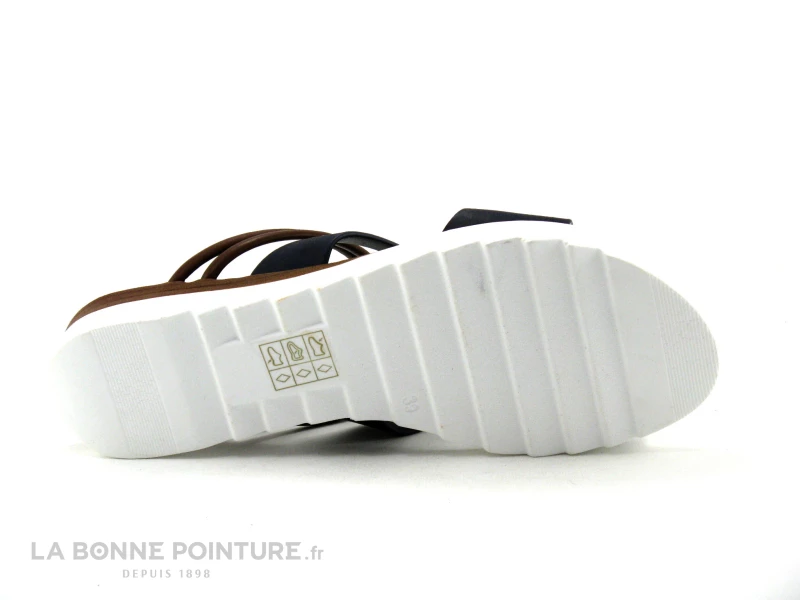Cette mule Femme bleu marine et marron est ornée de trois cercles dorés fixés sur le dessus de la chaussure.
