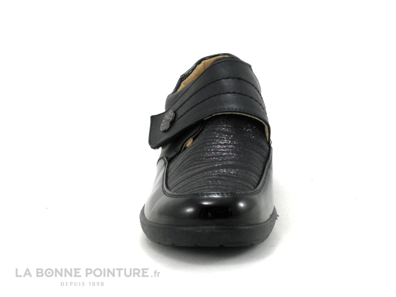 Cette chaussure basse Femme est en simili cuir noir, associant des parties lisses vernies et zébrées.