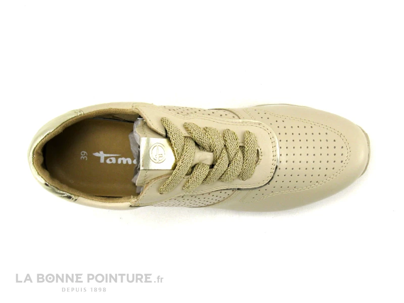 Cette basket mode Femme Tamaris 1-23614-20 est principalement en cuir beige, avec de petites touches de doré.