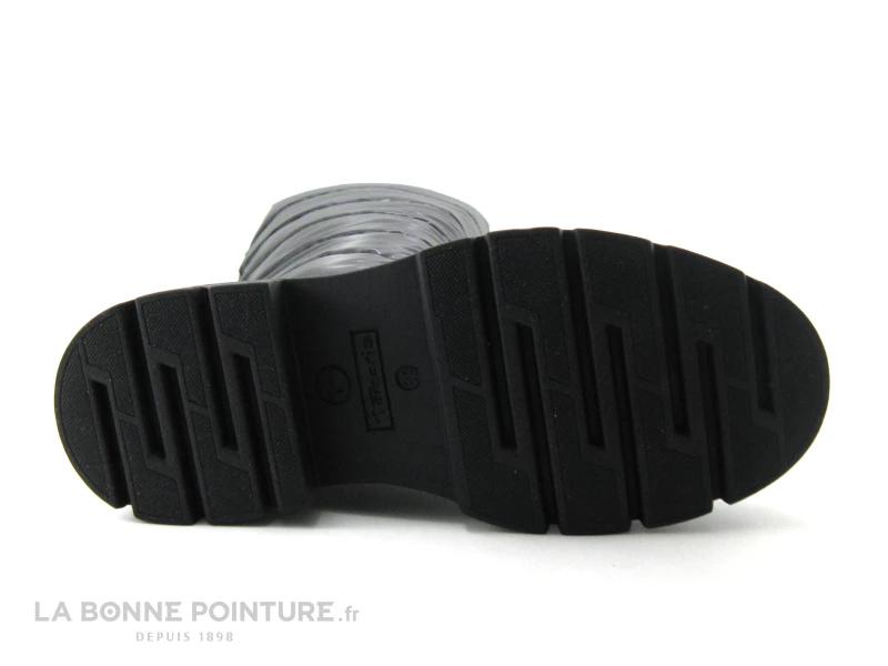 La base de cette botte plateforme Tamaris 26629 est en cuir lisse noir, avec la partie haute en textile matelassé noir.