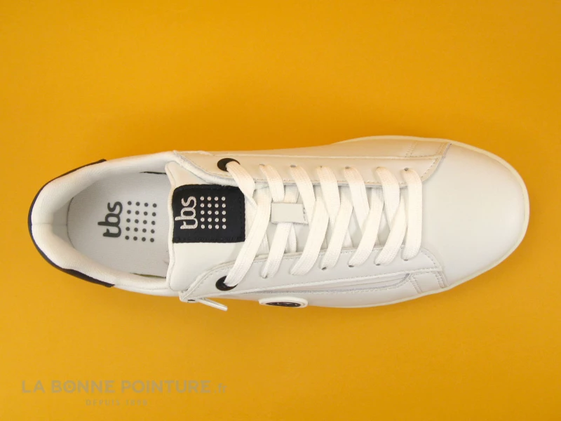 Cette basket de ville Homme Tbs Lillian est blanche avec du bleu marine à l’arrière et sur la languette.