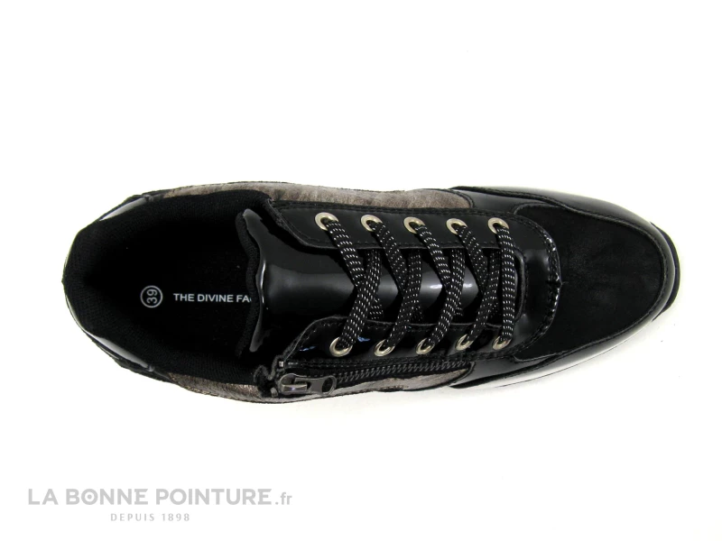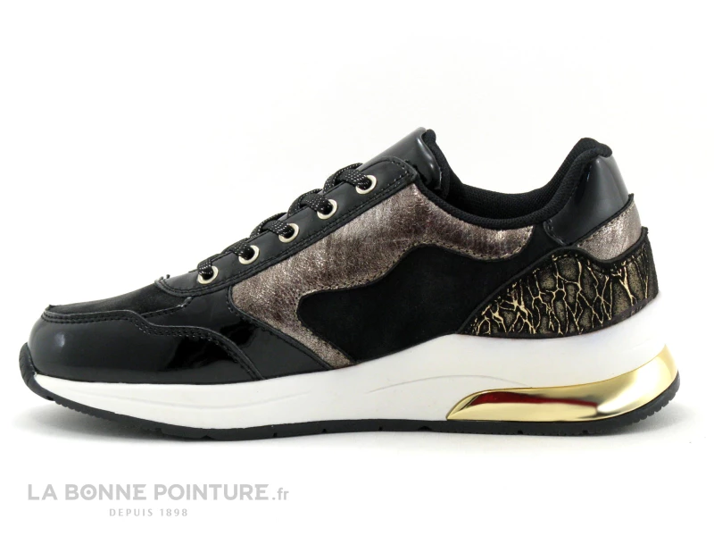 Ces sneakers Femme sont noires et bronze/Or, avec des parties vernies et métallisées.